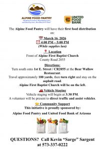 The Alpine Food Pantry will have their first food distribution on March 16, 2026. It will take place from 4:00 p.m. to 5:00 p.m. (While supplies last).